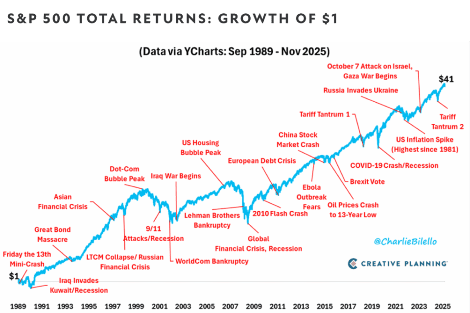 This chart exhibits the expansion of $1 within the S&P 500 from September 1989 by October 2025 (ending at $41). All through the years, main occasions linked to market crashes are labeled, such because the European debt disaster, Brexit vote, COVID-19 crash and extra, for example the resiliency of the market over time.