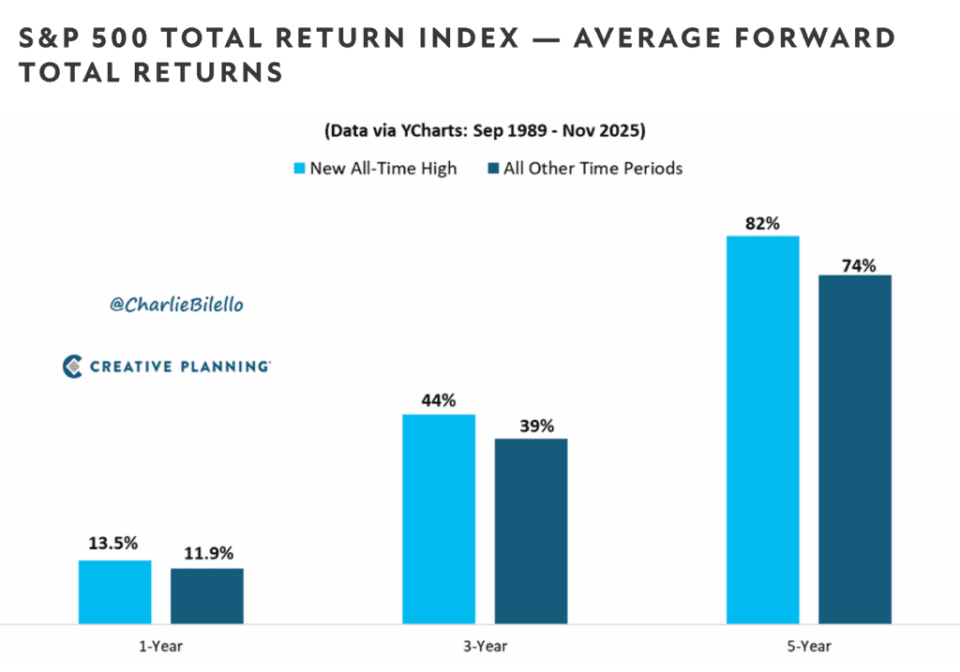 This chart exhibits the typical ahead whole returns of the S&P 500 from September 1989 by November 2025. For a one-year interval, the brand new all-time excessive common is 13.5%, whereas the typical for all different time durations is 11.9%. For a three-year interval, the brand new all-time excessive common is 44%, whereas the typical for all different time durations is 39%. For a five-year interval, the brand new all-time excessive common is 82%, whereas the typical for all different time durations is 74%.