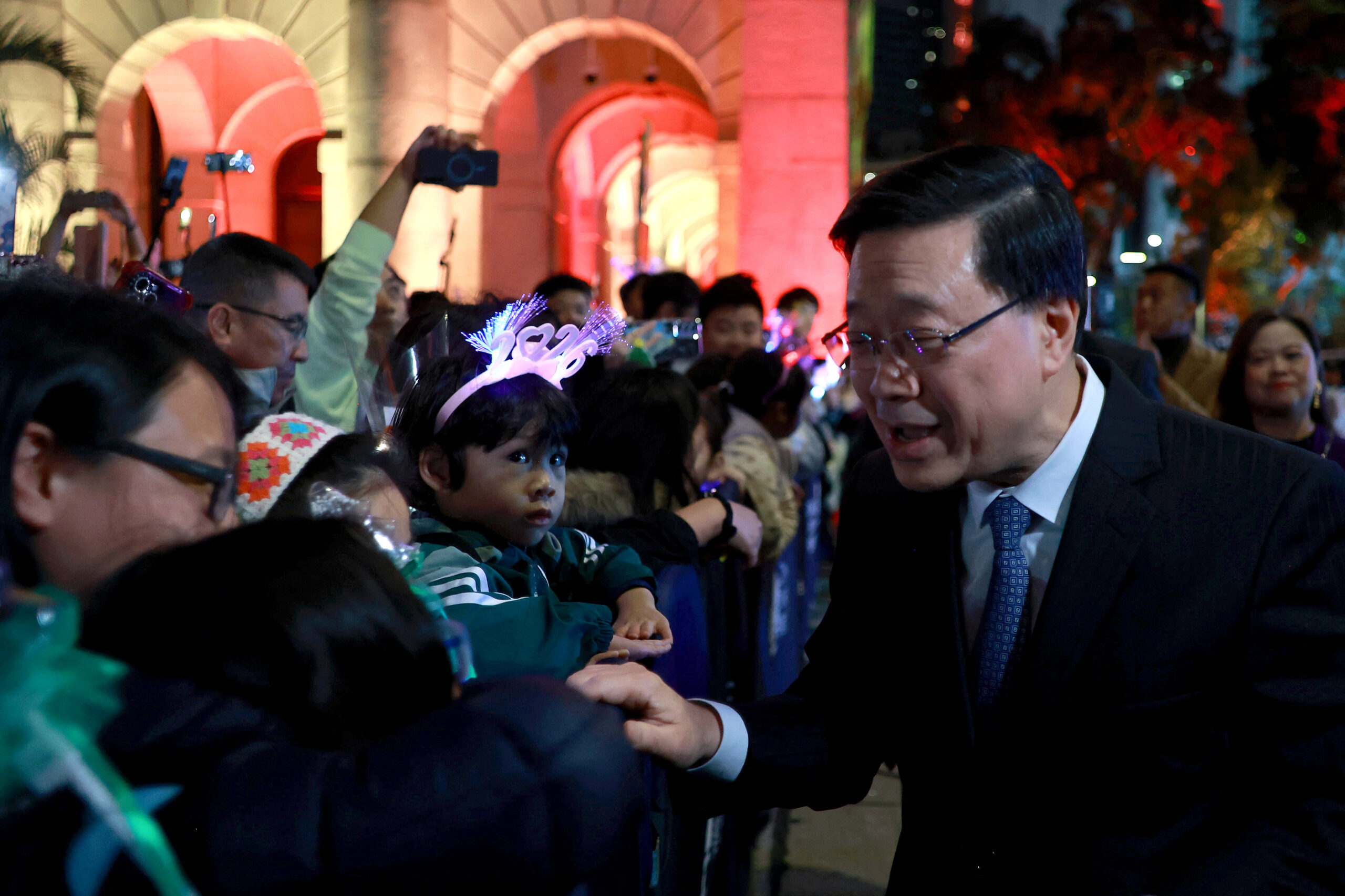Chief Govt of Hong Kong John Lee (R) greets the gang as he arrives on the New Yr’s countdown celebrations in Central, Hong Kong, on December 31, 2025. (Picture by Might JAMES / AFP)